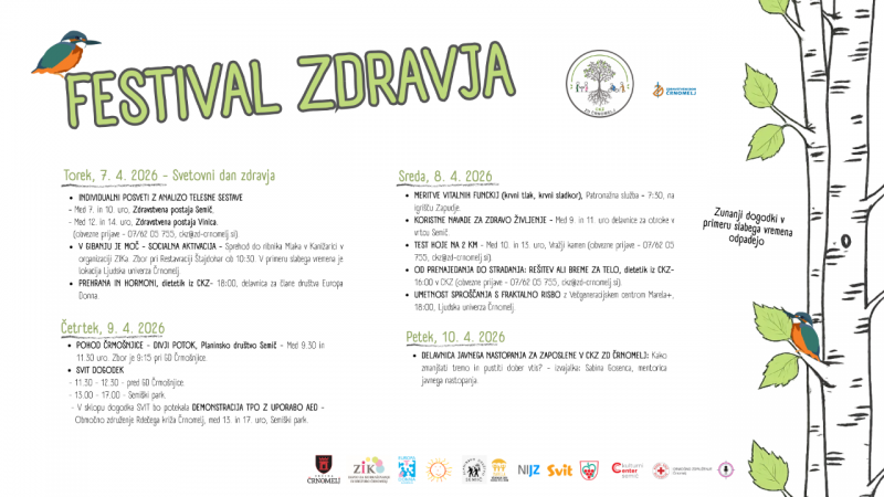 V okviru Festivala zdravja 2026, ki ga prireja CKZ ZD ČRNOMELJ, vas vabimo na sprehod do ribnika Mlaka v Kanižarici. Zbor ob 10.30 pri Restavraciji Štajdohar v Kanižarici in odhod do ribnika.