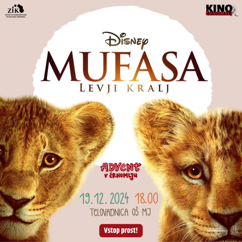 V sklopu Adventa v Črnomlju pripravljamo veliko BREZPLAČNO premierno projekcijo legende o Mufasi, mlademu levjemu mladiču, Rafiki v Športni dvorani OŠ Mirana Jarca Črnomelj.