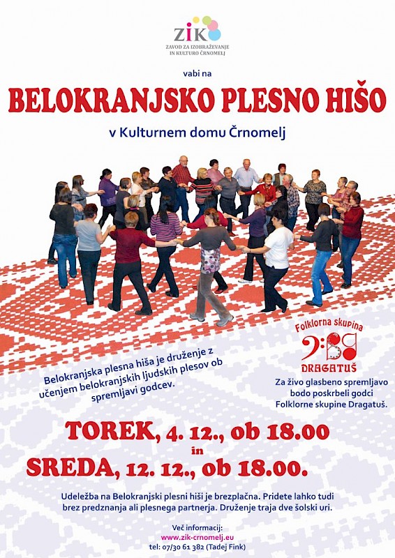 Vabljeni na brezplačno delavnico belokranjskih ljudskih plesov ob živi glasbeni spremljavi godcev.