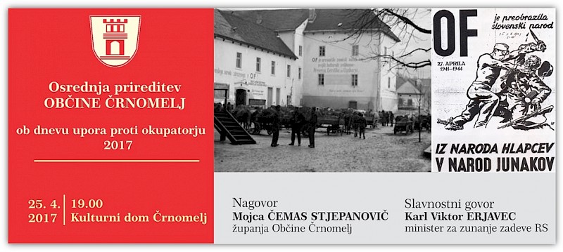 Vabimo na osrednjo prireditev Občine Črnomelj ob Dnevu upora proti okupatorju. Nagovor: Mojca Čemas Stjepanovič, županja Občine Črnomelj. Slavnostni govor: Karl Viktor Erjavec, minister za zunanje zadeve RS.