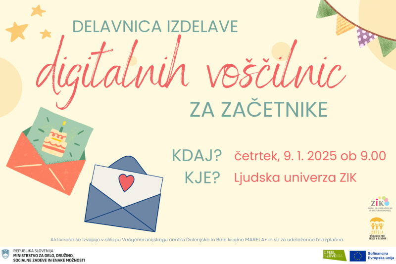 Pridružite se nam na sproščeni in ustvarjalni delavnici, kjer boste osvojili veščine izdelave čudovitih elektronskih voščilnic s pomočjo brezplačnega programa Canva. To je priložnost, da se naučite nekaj novega in razveselite svoje bližnje z unikatnimi voščilnicami, izdelanimi z ljubeznijo.