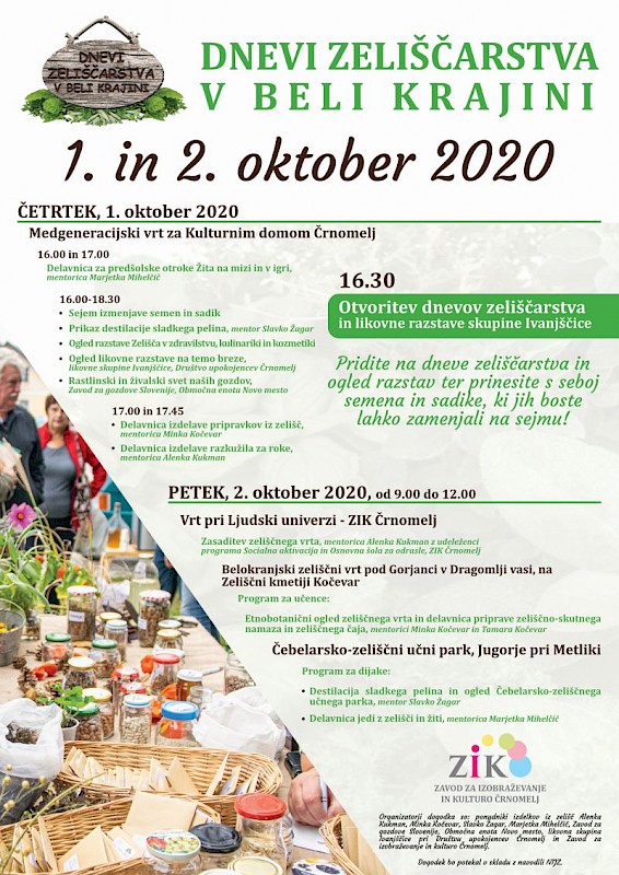 Dneve zeliščarstva bomo odprli na medgeneracijskem vrtu Kulturnega doma Črnomelj v četrtek, 1. oktobra 2020, ob 16.30 s kratkim kulturnim programom in likovno razstavo skupine Ivanjščice.