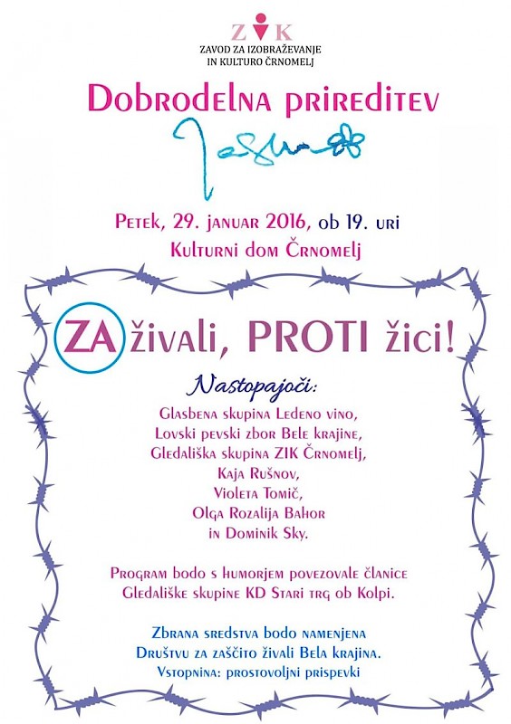 Rdeča nit 9. Dobrodelne prireditve Jasna je "ZA živali, PROTI žici!" Nastopili bodo belokranjski izvajalci: glasbena skupina Ledeno vino, Gledališka skupina ZIK Črnomelj, Lovski pevski zbor Bele krajine, Olga Rozalija Bahor, Violeta Tomič, Kaja Rušnov in Dominik Sky. Program bodo humorno povezovali člani Gledališke skupine KD Stari trg. Vstopnina: prostovoljni prispevki. Sceno bodo s svojimi slikami na temo žice in Kolpe oblikovale belokranjske likovne ustvarjalke, članice Društva upokojencev Črnomelj z imenom Ivanjščice.