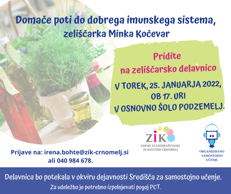 Živimo v času, ko je še bolj potrebno skrbeti za dober imunski sistem. Kako nam pri tem lahko pomagajo zelišča in tradicionalni pripravki iz zelišč? Pridite na delavnico zeliščarske Minke Kočevar, ki bo v prostorih Osnovne šole v Podzemlju. Predstavili vam bomo tudi knjižico Zelišča v kulinariki.