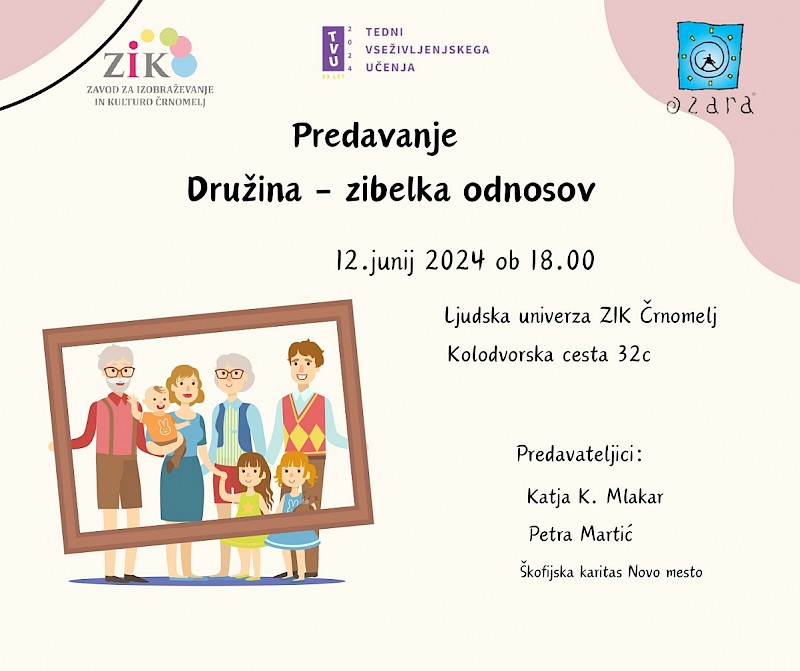 ZIK Črnomelj v sodelovanju z društvom Ozara in Škofijsko Karitas Novo mesto v sklopu Tednov vseživljenjskega učenja organizira predavanje Družina - Zibelka odnosov. Predavanje bo 12. junija ob 18:00 na Ljudski univerzi ZIK Črnomelj (učilnica Pisanica). Vabljeni!