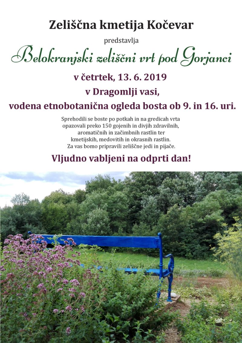 Zeliščna kmetija Kočevar vabi na etnobotanični ogled Belokranjskega zeliščnega vrta pod Gorjanci v Dragomlji vasi. Opazovali boste lahko preko 150 gojenih in divjih zdravilnih, aromatičnih in začimbnih rastlin ter kmetijskih, medovitih in okrasnih rastlin .