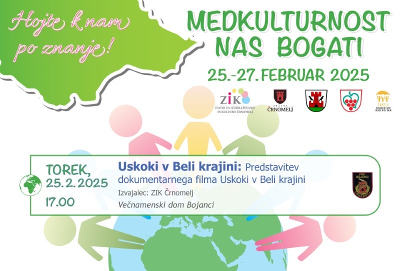 Letošnji dogodek Hojte k nam po znanje, ki nosi naslov Medkulturnost nas bogati, bo potekal v Črnomlju v torek, 25. februarja 2025, od 17. do 19. ure večnamenskem domu na Bojancih. Predvajali bomo kratki dokumentarni film Uskoki v Beli krajini, ki govori o življenju potomcev Uskokov v Beli krajini in sožitju z lokalnim prebivalstvom kljub kulturni in narodni drugačnosti. Dokumentarni film so pod mentorstvom režiserke Maje Weiss in asistenta Tomislava Urha, ustvarili udeleženci delavnice dokumentarnega filma Filmskega tabora Kolpa 2022.