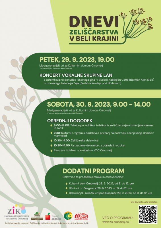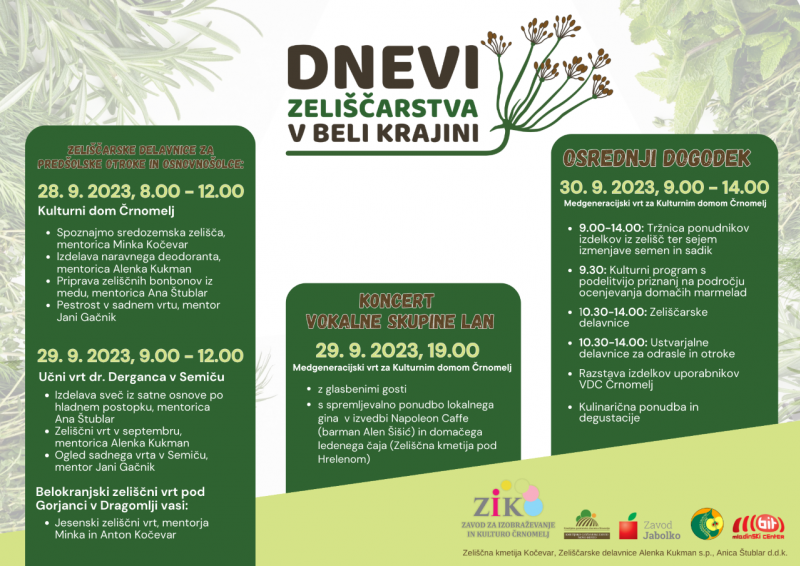 Koncert Vokalne skupine Lan s spremljevalno ponudbo lokalnega gina v izvedbi Napoleon Caffee (barman Alen Šišić) in domačega ledenega čaja Zeliščne kmetije pod Hrelenom na Medgeneracijskem vrtu za Kulturnim domom Črnomelj.