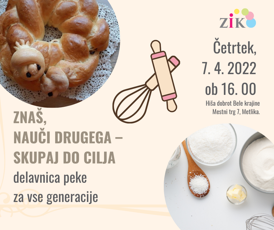 Prijazno vabljeni, da se nam pridružite na delavnici ZNAŠ, NAUČI DRUGEGA – SKUPAJ DO CILJA, ki bo potekala v četrtek, 7. 4. 2022, od 16.00 do 18.00 v Hiši dobrot Bele krajine Mestni trg 7, Metlika. Na delavnici, ki je namenjena vsem generacijam, bomo pod mentorstvom Tončke Škof, pekli praznični kruh in spoznali velikonočne jedi in običaje.