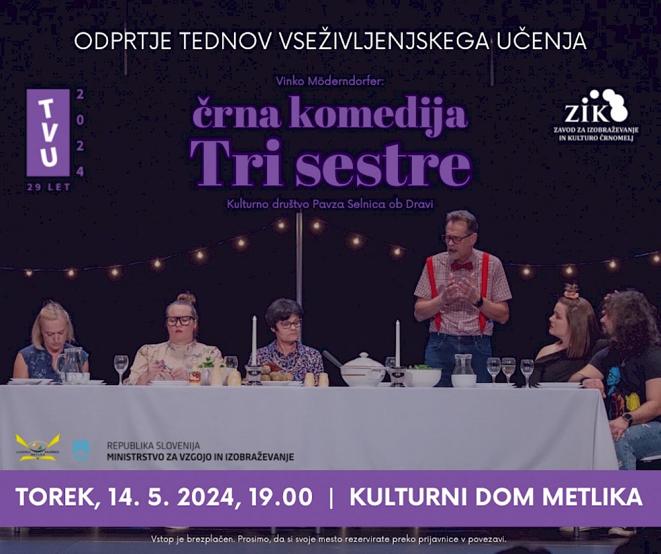 Letos bomo otvoritev TVU obeležili z gledališko predstavo Tri sestre v torek, 14. maja 2024, ob 19:00 v Kulturnem domu Metlika.