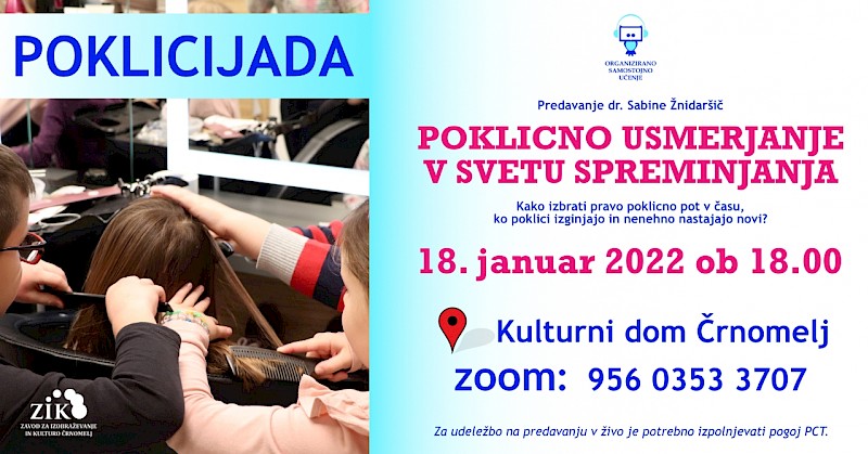 Vabljeni na predavanje dr. Sabine Žnidaršič: Poklicno usmerjanje v svetu spreminjanja; Kako izbrati pravo poklicno pot v času, ko poklici izginjajo in nenehno nastajajo novi. Predavanje bo v torek, 18. 1. 2022, ob 18:00 in bo potekalo sočasno v živo v Kulturnem domu Črnomelj ter preko ZOOM-a (https://arnes-si.zoom.us/j/95603533707). Predavanje je namenjeno predvsem staršem.