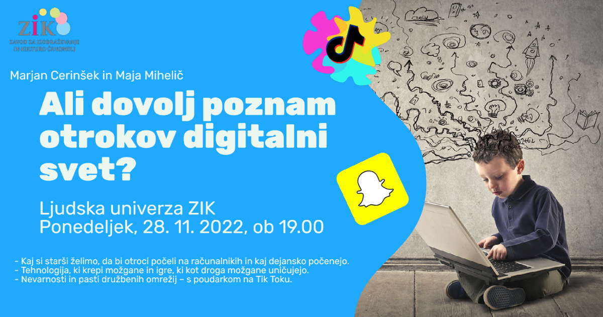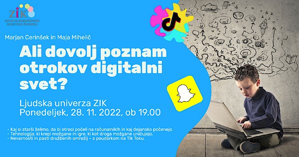 Vabljeni na predvanje "Ali dovolj poznam otrokov digitalni svet?" Predavanje bo v ponedeljek, 28. 11. 2022, ob 19.00 na Ljudski univerzi ZIK.