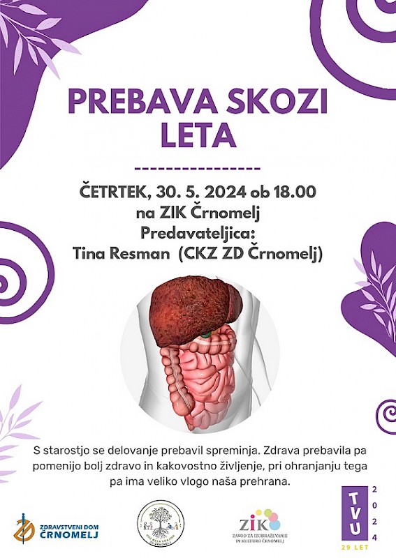 V okviru Tednov vseživljenjskega učenja vabljeni na predavanje Tine Resman, univ. dipl. živ. teh. (CKZ Črnomelj), o pomembnosti prebavil in vpliv prehrane nanje. Predavanje bo na Ljudski univerzi ZIK Črnomelj v četrtek, 30. maja, ob 18:00, v učilnici Pisanica. Vljudno vabljeni!