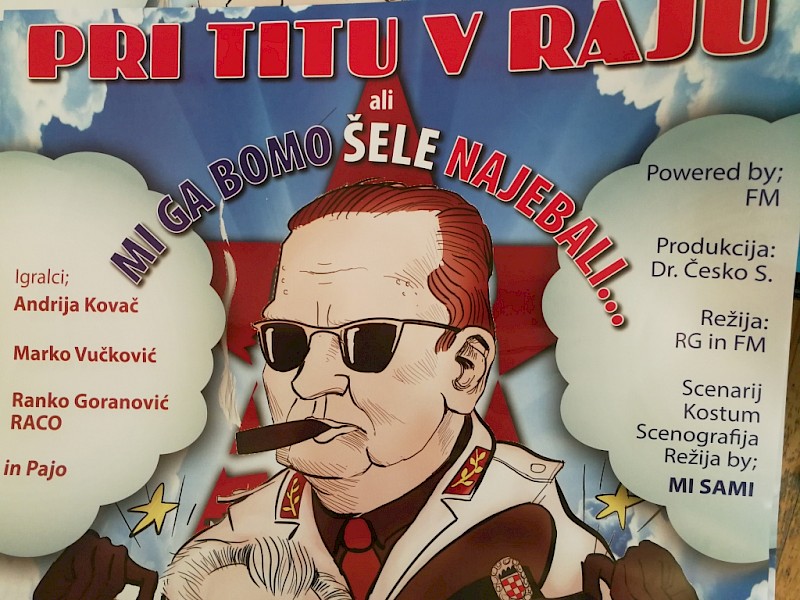 Pri Titu v raju je komedija rezke satire in kot pravi Ranko Goranović, znani igralec in eden od avtorjev komedije: „To je komedija, ki ne žali in ne podcenjuje osebnih prepričanj. A tudi ne oporeka političnih stališč in ciljev. Predstava je postavljena v obdobje med časom nekdanje SFRJ in sedanjega, evropskega načina življenja. Na duhovit način prikazuje napake sedanjih politikov, tudi skozi like, ki so za nekoga pomembni, za druge pa nepomembni. Resnica pa je, da so ti liki bili krojači današnjega političnega, geografskega in ekonomskega zemljevida: Evrope, Balkana in sosednjih držav." Občinstvo do solz nasmejejo odličen scenarij, dobro oponašanje likov in pogoste komične improvizacije: Tito barva raj in išče preko Googla mobilno številko Rudija Čajevca, saj mora biti raj čist in urejen. Oglasita pa se mu Slobodan in Franjo, ki mu pomagata pri njegovi nameri. Iz tega zapleta pa se razvije vrhunska komedija, ki je v mnogih krajih nekdanje skupne države doživela rekordno gledanost in požela ogromno smeha in številne ovacije!