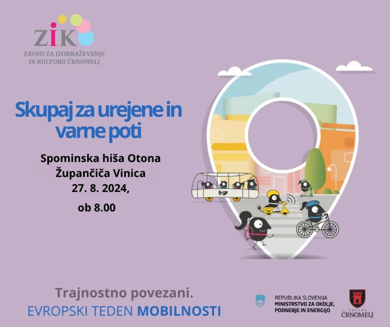 V okviru Evropskega tedna mobilnosti vas vabimo v Spominsko hišo Otona Župančiča v Vinico, kjer bo potekal dogodek z naslovom Skupaj za urejene in varne poti. Na delavnici bomo spregovorili o problematiki peš in kolesarskih poti z vidika varnosti na območju Vinice in okolice. Dogodek bo organiziran v sodelovanju z Občino Črnomelj, Krajevno skupnostjo Vinica, Policijsko postajo Črnomelj in Šolo zdravja Vinica. Udeleženci dogodka bodo lahko predstavili in oblikovali predloge izboljšav, ki se bodo posredovali pristojnim na občini.