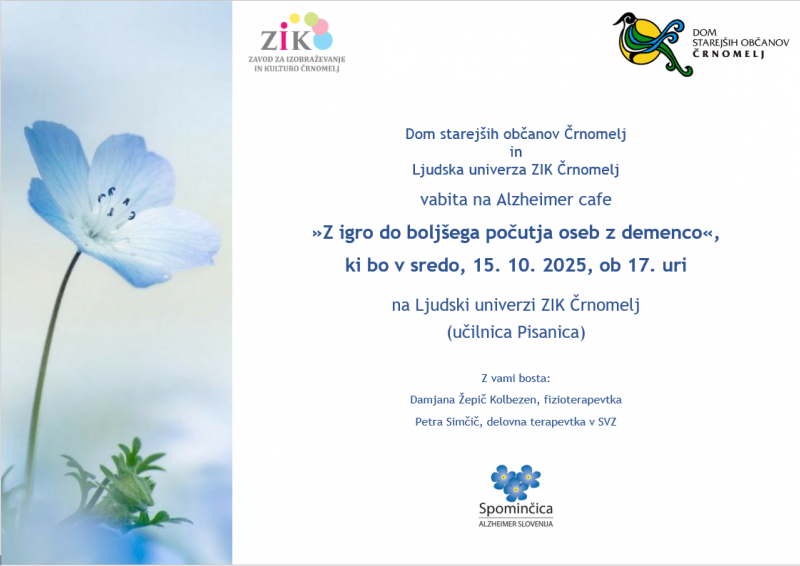 V sodelovanju z Domom starejših občanov Črnomelj vas vabimo na srečanje ALZHEIMER CAFE z naslovom ˝Z igro do boljšega počutja oseb z demenco˝, ki bo v sredo, 15. 10. 2025, ob 17. uri, na Ljudski univerzi ZIK Črnomelj. Z nami bosta Damjana Žepič Kolbezen, fizioterapevtka in Petra Simčič, delovna terapevtka v SVZ , zaposleni v DSO Črnomelj .
