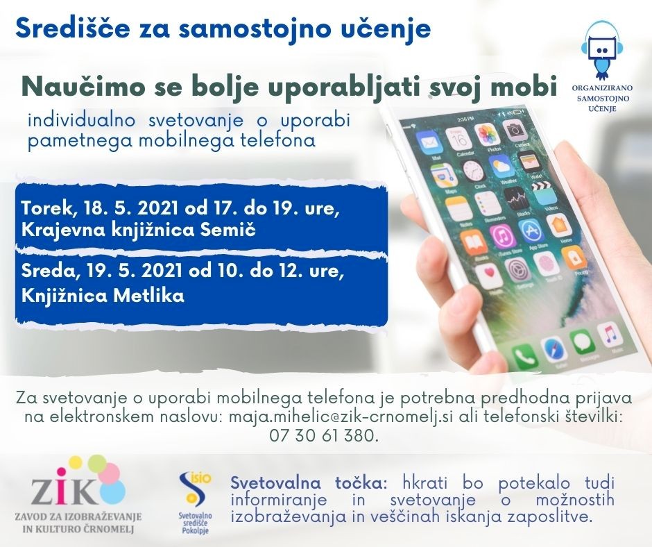 Ali imate težave pri uporabi pametnega telefona? Vabljeni na individualno usposabljanje o uporabi pametnega mobilnega telefona. Usposabljanje bo potekalo v sredo, 19. 5. 2021 od 10. do 12. ure v Knjižnici Metlika.