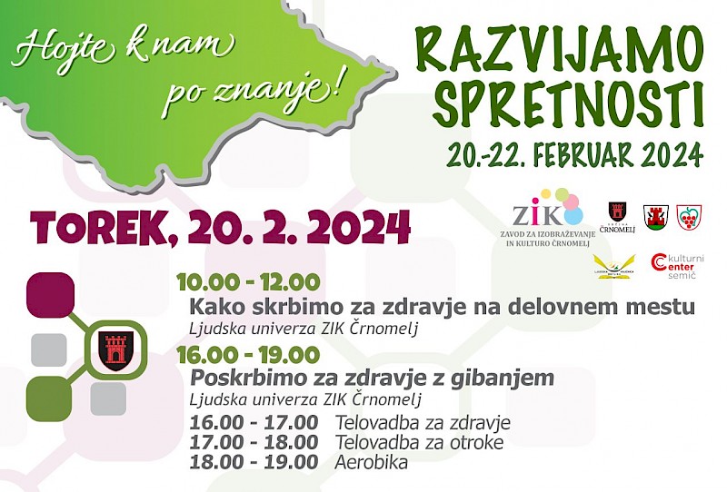 Letošnji dogodek Hojte k nam po znanje, ki nosi naslov Razvijamo spretnosti, bo potekal v Črnomlju v torek, 20. februarja 2024, od 16. do 19. ure v pisanici Ljudske univerze ZIK Črnomelj. Vabimo vas na brezplačno telovadbo za: