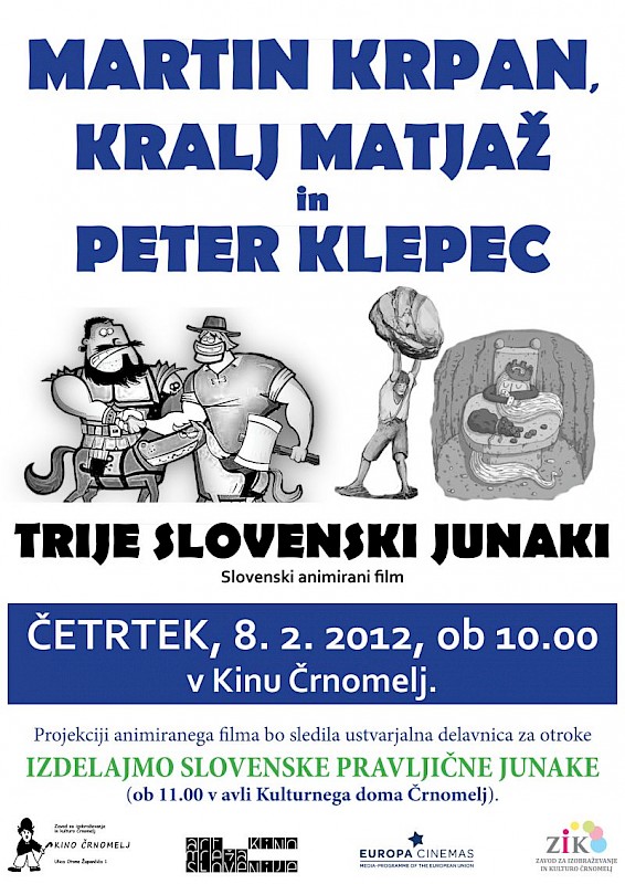 Vabimo otroke 4+ v Kino Črnomelj na ogled treh kratkih animiranih filmov: Kralj Matjaž, Peter Klepec in Martin Krpan. Po projekciji sledi delavnica v avli doma z naslovom Izdelajmo si svoje pravljične junake, ki jo bo vodila Simona Štirn. Vstopnine ni!