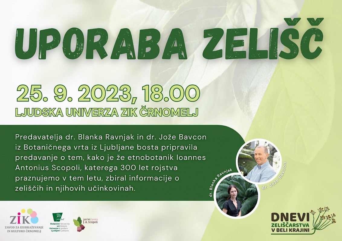 Predavatelja dr. Blanka Ravnjak in dr. Jože Bavcon iz Botaničnega vrta iz Ljubljane bosta pripravila predavanje o tem, kako je že etnobotanik Ioannes Antonius Scopoli, katerega 300 let rojstva praznujemo v tem letu, zbiral informacije o zeliščih in njihovih učinkovinah.
