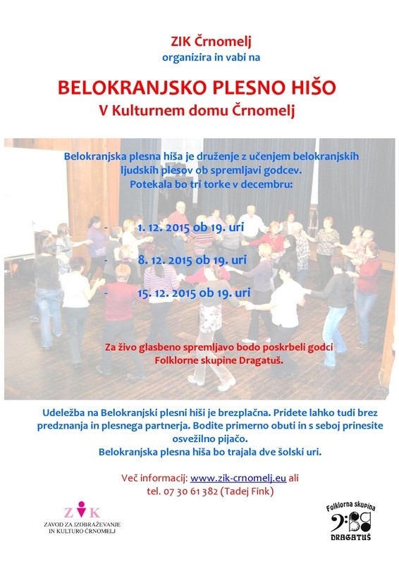 Ponovno bomo tri decembrske torke plesali in se učili belokranjskih ljudskih plesov. Za glasbo bodo poskrbeli godci Folklorne skupine Dragatuš. Udeležba je brezplačna. Pridružite se nam.