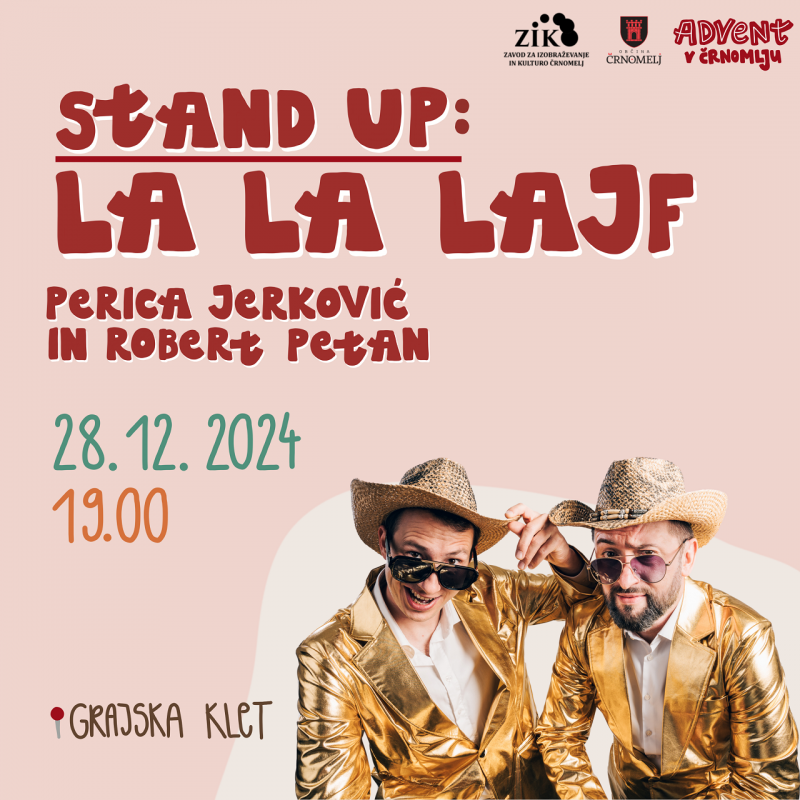 19:00 – 20:00 | La La Lajf: stand-up predstava (Perica Jerković, Robert Petan), vstopnina: 10 evrov