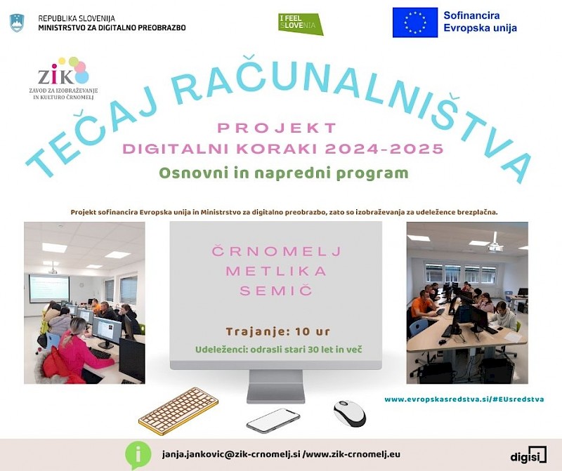 V mesecu juliju začnemo z brezplačnimi 10-urnimi tečaji računalništva v Črnomlju, Metliki, Podzemlju in Semiču. Namenjeni so odraslim starim 30 let in več. Izvajali bomo osnovni program računalništva s področja informacijske in podatkovne pismenosti, komuniciranja in sodelovanja, ustvarjanja digitalnih vsebin, varnosti in reševanja problemov. Projekt sofinancira Evropska unija in Ministrstvo za digitalno preobrazbo. Več informacij na www.evropskasredstva.si in https://www.zik-crnomelj.eu/sl/projekti/digitalni-koraki-2024-2025/.