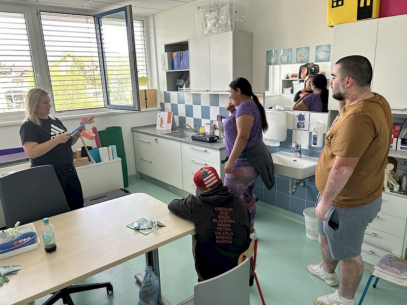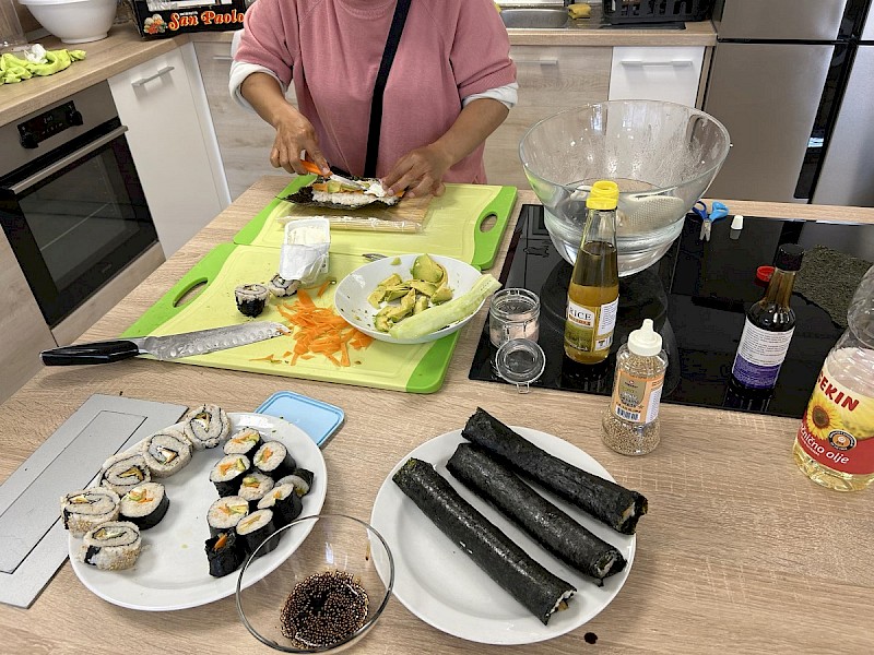 Lahko smo se tudi preizkusili v krtačenju konja in ga celo zajahali. Obisk društva smo izvedli v okviru dogodka 15. Dan za spremembe, ki ga je organiziral ZIK Črnomelj. V ponedeljek, 8. aprila, smo v Kulturnem domu Črnomelj obeležili Dan Romov. ZIK Črnomelj je organiziral prireditev, na kateri sta se predstavili tudi udeleženki osnovne šole za odrasle. V današnji družbi, ki je izpostavljena različnim izzivom, je še toliko bolj pomembna skrb za kulturno bogastvo vseh, ki živijo na območju Republike Slovenije ter integracija posameznikov v družbo in njihovo aktivno vključevanje v kulturno udejstvovanje. Po prireditvi smo imeli pogostitev z golažem, ki smo ga skuhali v petek. V torek, 9. aprila, smo obiskali Zdravstveni dom Črnomelj, kjer smo si ogledali stojnice v okviru Festivala zdravja. Nato smo imeli s Centrom za krepitev zdravja posvet o ustni higieni. Naučili smo se pravilno ščetkati in skrbeti za svoje zobe. Odpravili smo se tudi v Gasilski dom Črnomelj, kjer so nam prostovoljni gasilci predstavili svojo dejavnost. Pokazali so nam svojo opremo in vozila. Preizkusili smo se tudi v vaji gašenja požara. V sredo, 10. aprila, pa smo imeli kuharsko delavnico z učiteljico Novito, ki nas je naučila, kako se pripravi sushi. Na koncu smo ga seveda tudi poizkusili. Nato pa smo se odpravili v Krajinski park Lahinja, kjer nam je strokovni delavec Gregor Šmalcelj predstavil naravne in družbene značilnosti parka. Ogledali smo si staro domačijo in poskušali ugotoviti, za kaj so nekoč uporabljali predmete, ki so v hiši. Obisk parka smo zaključili s sprehodom do Nerajskih lugov, kjer smo izvedeli več o rastlinstvu in živalstvu parka.