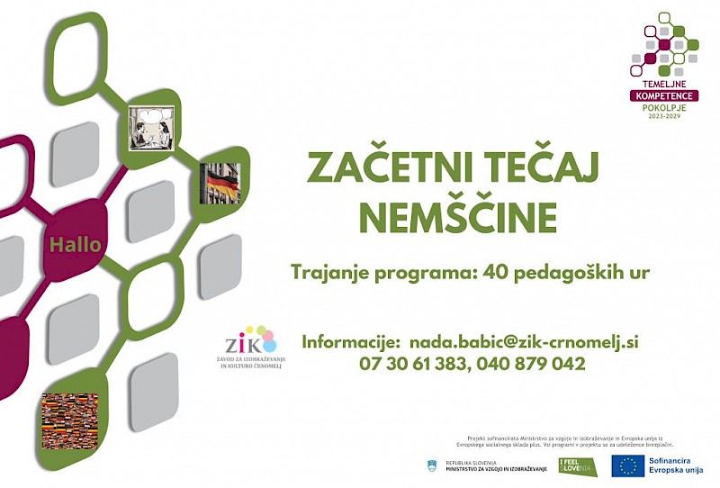 Izobraževanje v programu ZAČETNI TEČAJ NEMŠČINE bomo izvajali v okviru projekta Temeljne kompetence Pokolpje 2023-2029 in je za udeležence brezplačno. Projekt sofinancirata Republika Slovenija, Ministrstvo za vzgojo in izobraževanje, in Evropska unija iz Evropskega socialnega sklada Plus.