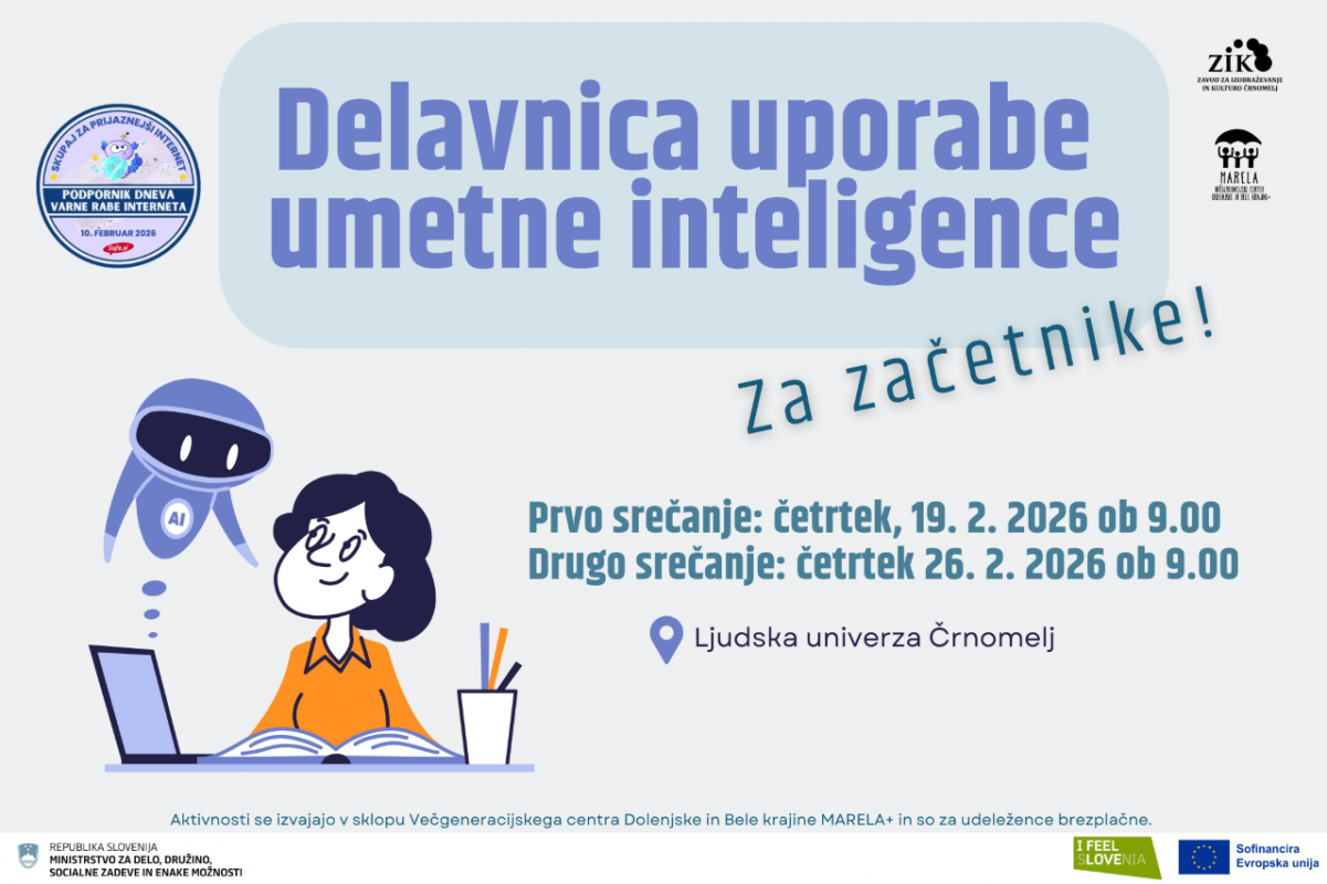 Aktivnosti v sklopu Večgeneracijskega centra Dolenjske in Bele krajine MARELA+ so za udeležence brezplačne. Projekt sofinancirata Republika Slovenija, Ministrstvo za delo, družino, socialne zadeve in enake možnosti in Evropska unija iz Evropskega socialnega sklada plus.