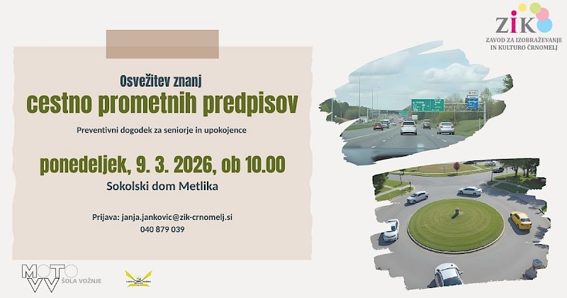 Vabljeni na brezplačno usposabljanje za starejše voznike in voznice v cestnem prometu, ki ga organiziramo, v sodelovanju z Moto Vv, šolo vožnje Vladimir Vladič in Ljudsko knjižnico Metlika, v ponedeljek, 9. marca 2026, ob 10.00 v Sokolskem domu Metlika. Na dogodku bodo udeleženci obnovili pravila varne vožnje po avtocesti in hitri cesti ter krožiščih, spoznali lokalno prometno problematiko in se seznanili z najpogostejšimi napakami in tveganji med vožnjo.