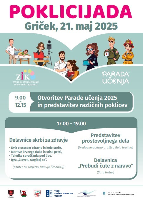 V sklopu tednov vseživljenjskega učenja 2025 bomo 21. maja 2025 na Gričku v Črnomlju izvedli Parado učenja - Poklicijado za vrtce in šole v Beli krajini.