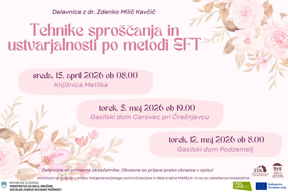 Aktivnosti v sklopu Večgeneracijskega centra Dolenjske in Bele krajine MARELA+ so za udeležence brezplačne. Projekt sofinancirata Republika Slovenija, Ministrstvo za delo, družino, socialne zadeve in enake možnosti in Evropska unija iz Evropskega socialnega sklada plus.